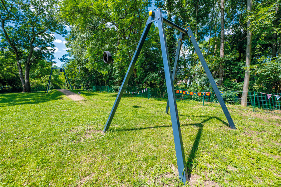 Die Kinderseilbahn gehört zu den attraktivsten Spielgeräten auf einem Spielplatz. Meist sind Kinderseilbahnen nur auf großen Abenteuerspielplätzen zu finden, doch unsere preisgünstigen espas Stahl-Seilbahnen sind auch für kleinere Spielplätze geeignet. Besonders die kürzere Ausführung mit 20 m lässt sich gut am Rande des Spielbereichs unterbringen. Die Kinder lieben es, mit Schwung am Drahtseil entlang zu gleiten, bis sie abrupt gestoppt und ein möglichst großes Stück zurückgeschleudert werden.